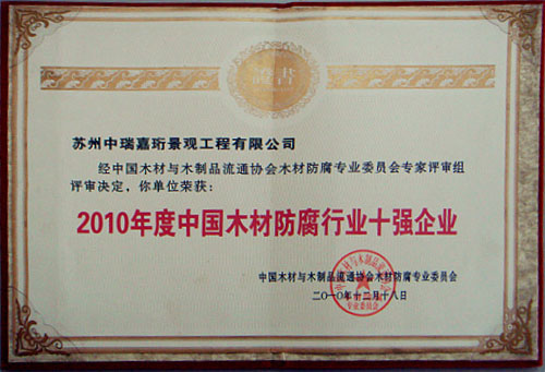2013年在《中國木材保護工業協會》的組織下,我公司榮獲本年度防腐木企業評選《防腐木材企業十強》稱號。